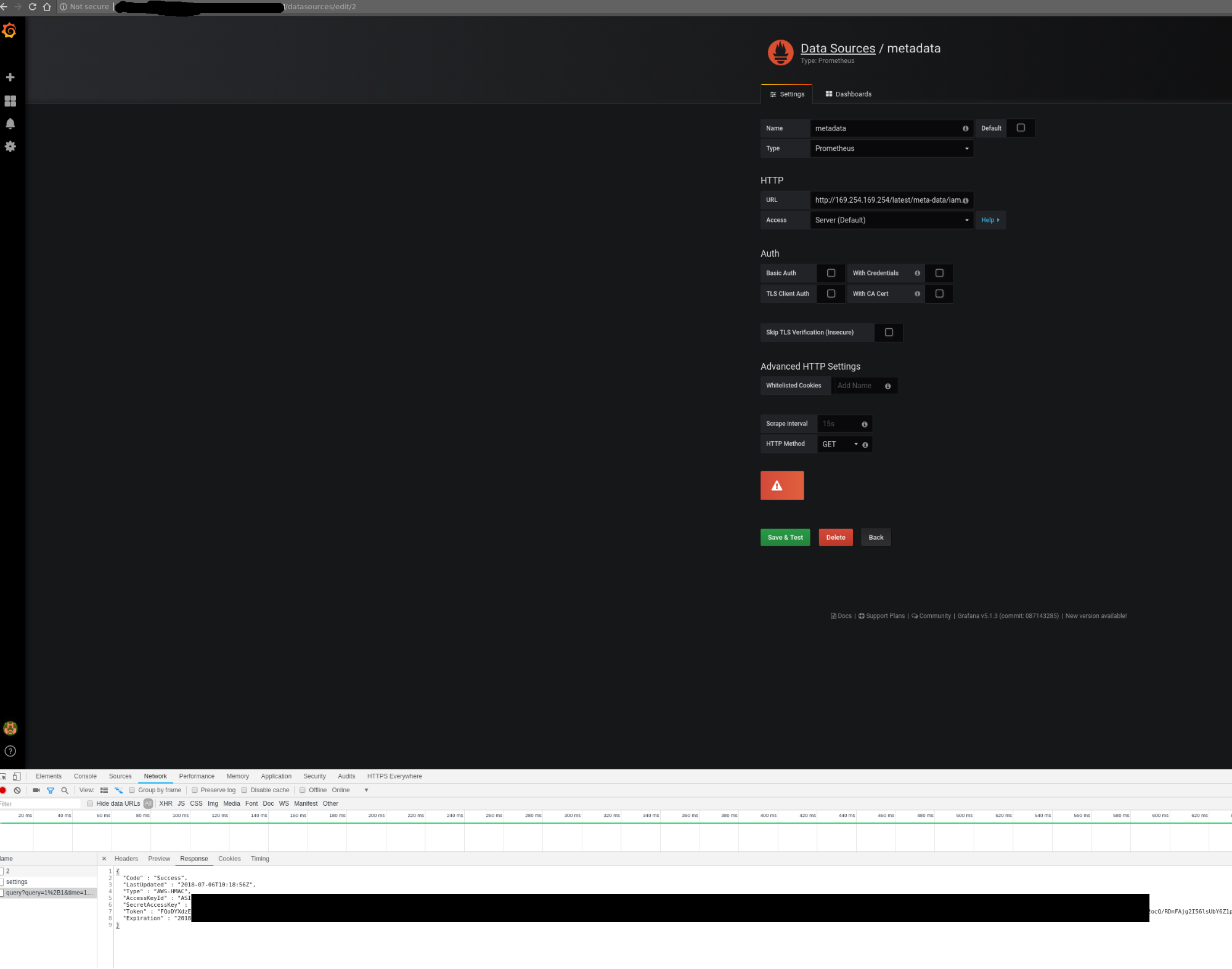 Unfortunately, that setup was not protecting the control plane network from nosy users. By configuring a new custom data source in Grafana, we could send HTTP requests to target the control plane network, for example the AWS metadata service. The reply payload is not displayed on the Grafana Web UI but it is possible to access it from the debugging console of the Chrome browser.